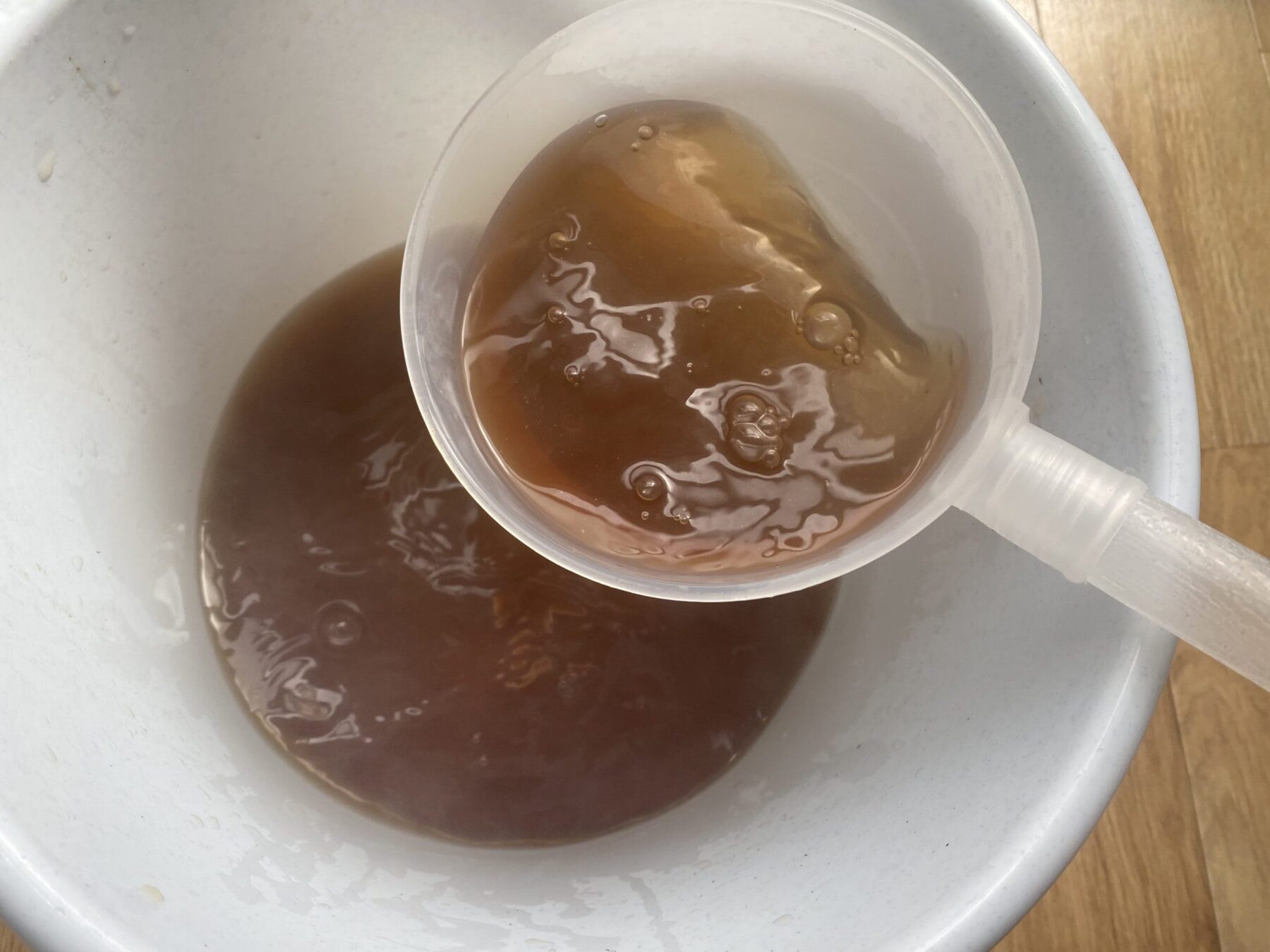 - 5染液のほうはひしゃくを使って空気を含ませるように10回ほど混ぜる