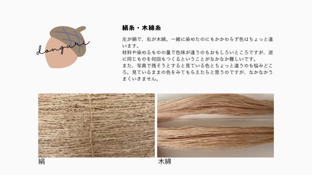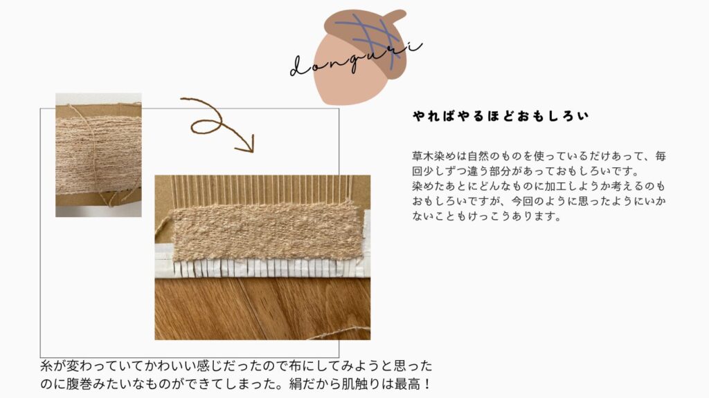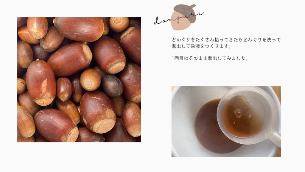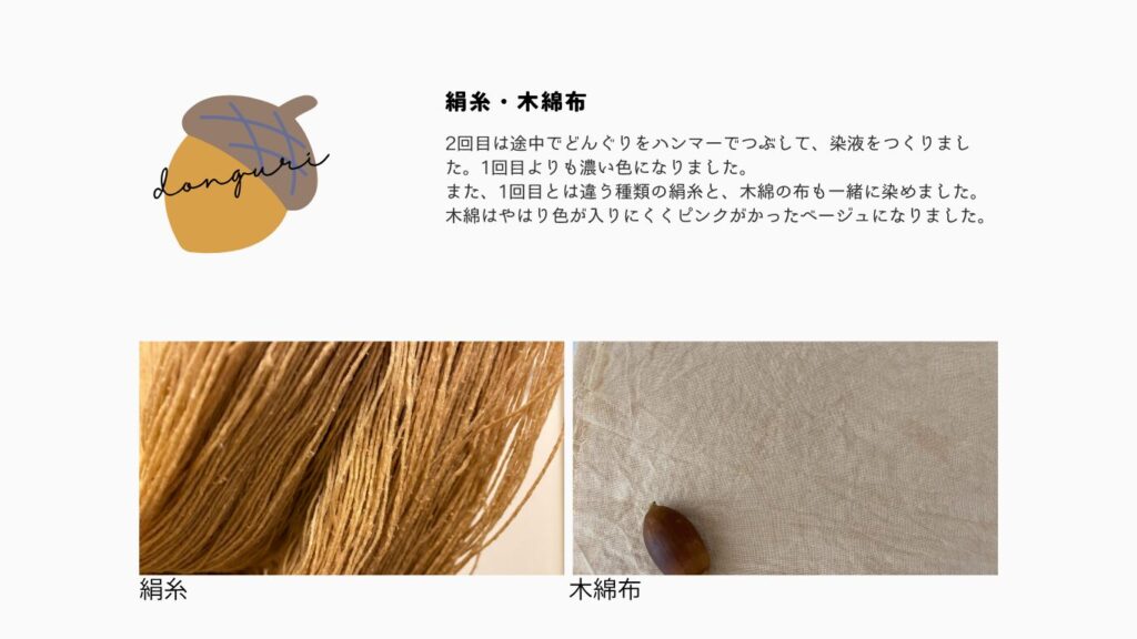 同じどんぐりでも煮出す回数や実をつぶすと色が変わるなど、一つの素材でもやり方しだいで変わりました。1度に試すことができる方法は限られているので、次回新しい方法を試してみたいと思います。