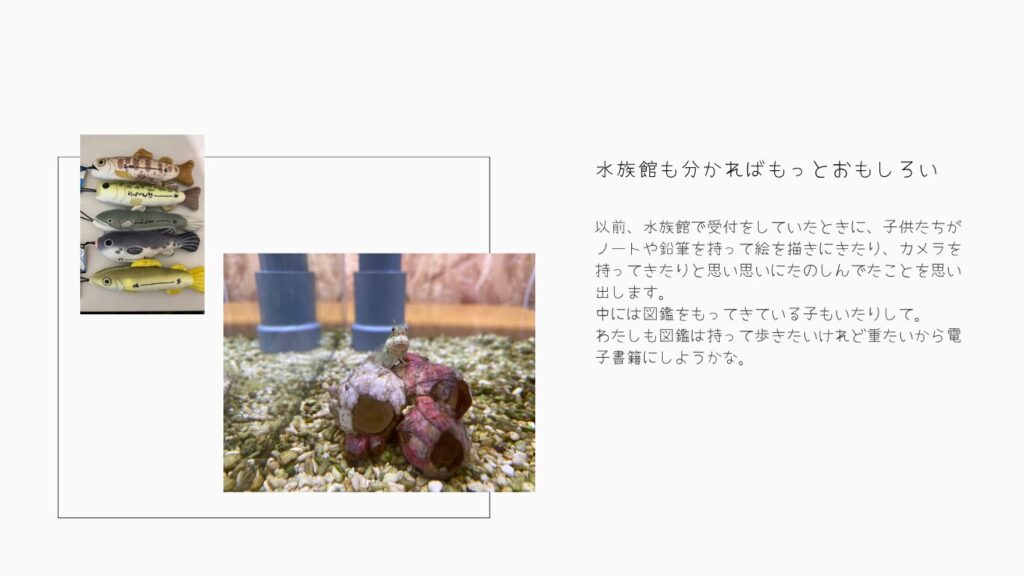 しかし、水族の学芸員である夫と行くと、そんな河川の展示だけの水族館がとてもおもしろく感じるから不思議です。分からなくて聞くと魚の名前や、特徴や、展示についての解説が聞けて、途端に身近に思えるのです。