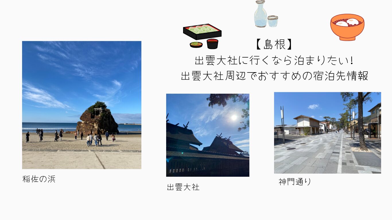 出雲大社に宿泊すれば、「出雲大社」「島根県立古代出雲歴史博物館(2026年9月までは耐震改修工事のため休館中)」「稲佐の浜」「日御碕神社」「日御碕灯台」「島根ワイナリー」などを観光するのに便利です。