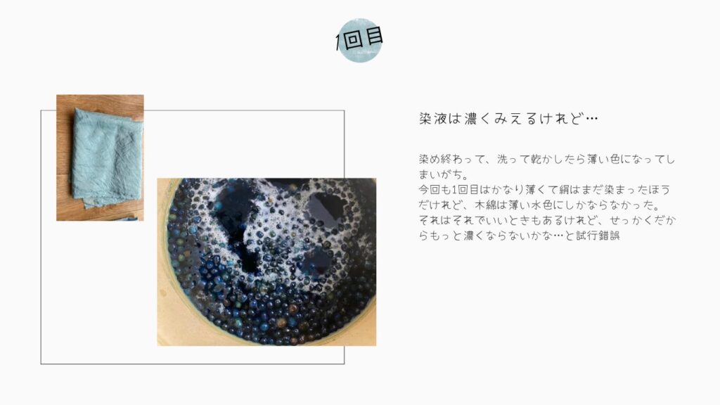 また、無媒染でもきれいな水色に染まり、同じように青系の藍の生葉染めよりも初心者向けのように感じました。