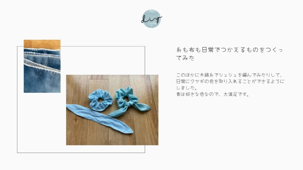 そして、染めた後の布や糸は身近な小物づくりにもぴったりですので、今後もいろいろなものをつくってみたいなと思います。そうなるともうちょっと量が多くできると嬉しいなとも考じています。