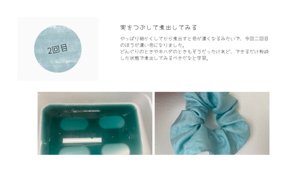ちなみに今回は実だけを集めて染めたのですが、後から調べて実の根元のガクの部分も染料にすることができると知りました。次回はガクでも試してみたいと思います。