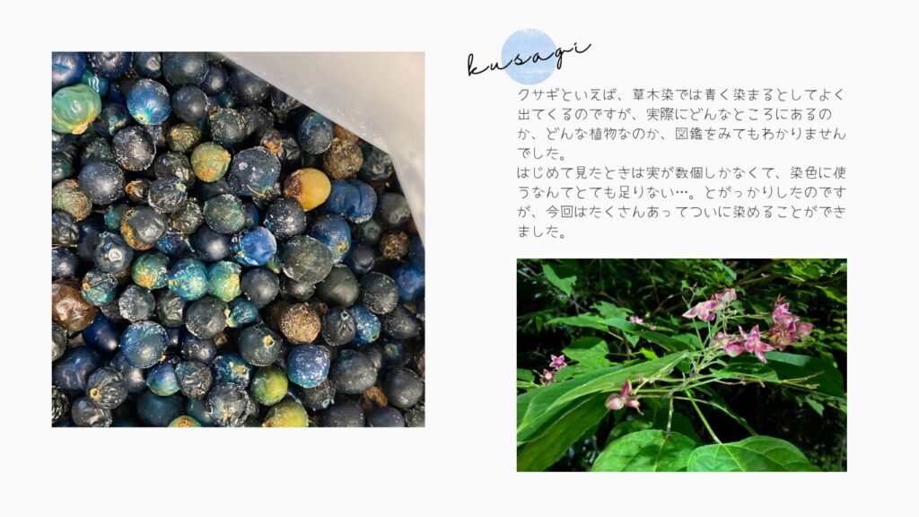 今回は無媒染でやってみましたが、クサギの色素(トリコトミン)は媒染によって色が変化します。次回は媒染ありでどんな色になるのかを比べてみたいと思います。